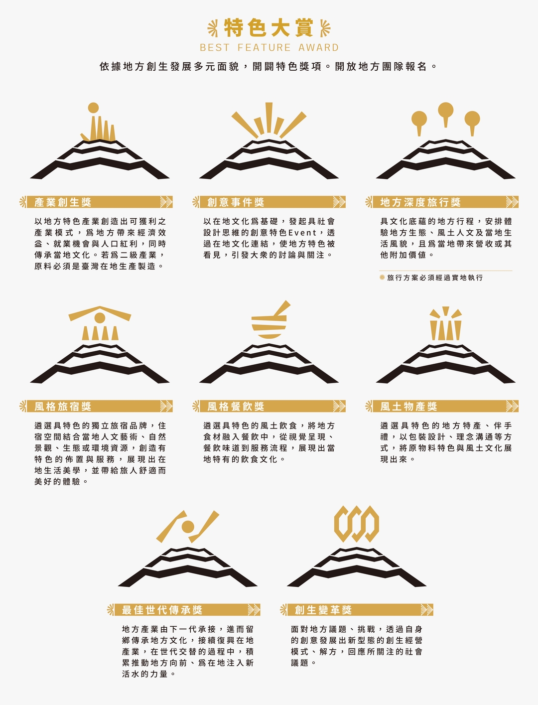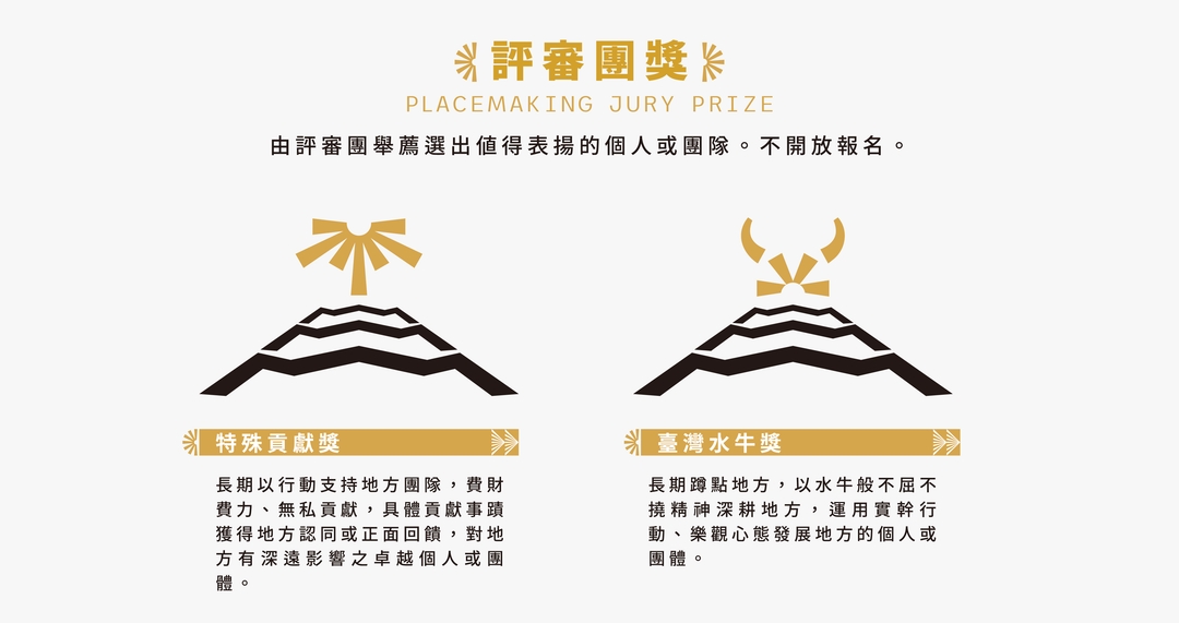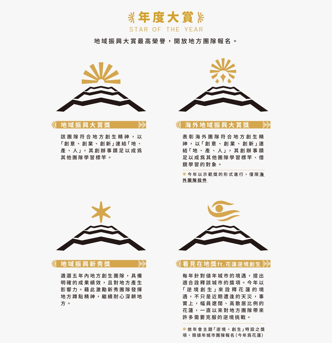 • 報名資格→開放報名獎項均為團體報名,團隊成員須超過半數為本國籍(海外地域振興大賞不在此限)