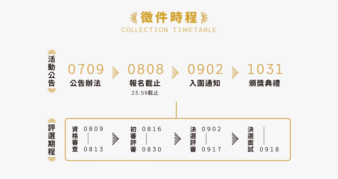 • 入圍通知→將於09/02(一)以 E-mail 及郵寄方式寄發入圍通知及相關事宜。請於指定時間內繳交後續資料,若遲遲聯絡不上,將視同放棄資格。