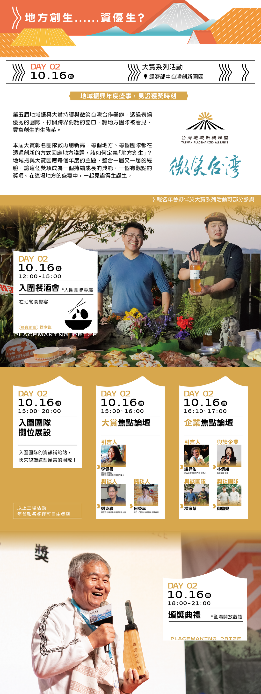 協辦單位|社團法人台灣城鄉永續關懷協會、財團法人台灣地方創生基金會、財團法人農村發展基金會、財團法人漣漪人文化基金會、財團法人台灣文創發展基金會、社團法人台灣公益團體自律聯盟、家樂福文教基金會、社團法人臺灣合作社照顧聯盟、廣輝國際管理顧問有限公司、魚樂天地鄉鎮 應援團、農業政策研究中心、見域工作室、台南新芽協會、影響力共創管理顧問有限公司、華麗轉身股份有限公司、國立暨南國際大學水沙連人文創新與社會實踐研究中心、國立暨南國際大學地方創生與跨域治理碩士學位學程、村落印象有限公司、One Life 玩生活、翔豪味食品有限公司、順騎自然有限公司、南投縣社區大學、紫銨整合行銷有限公司、好伴社計股份有限公司